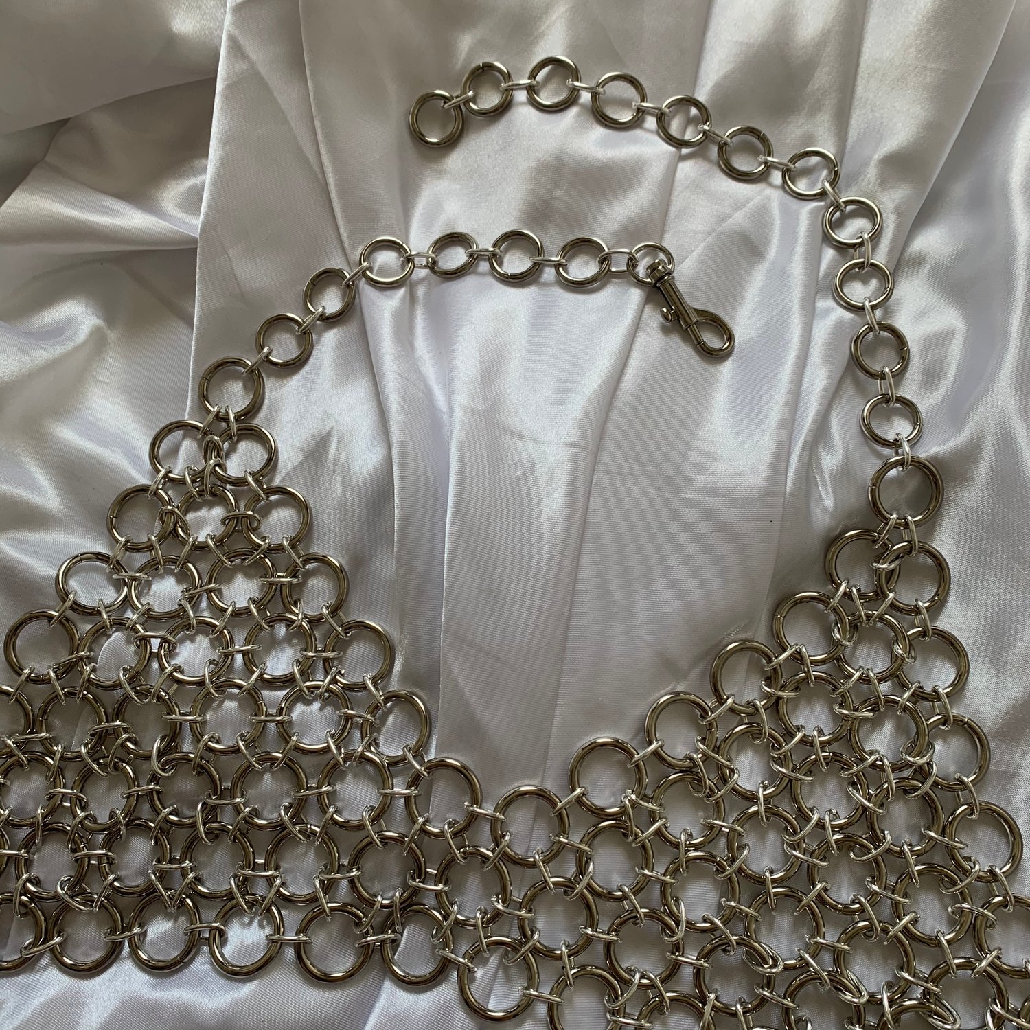 made with nickel plated steel rings and closes with two swivel clasps to make it adjustable around your back and back of neck