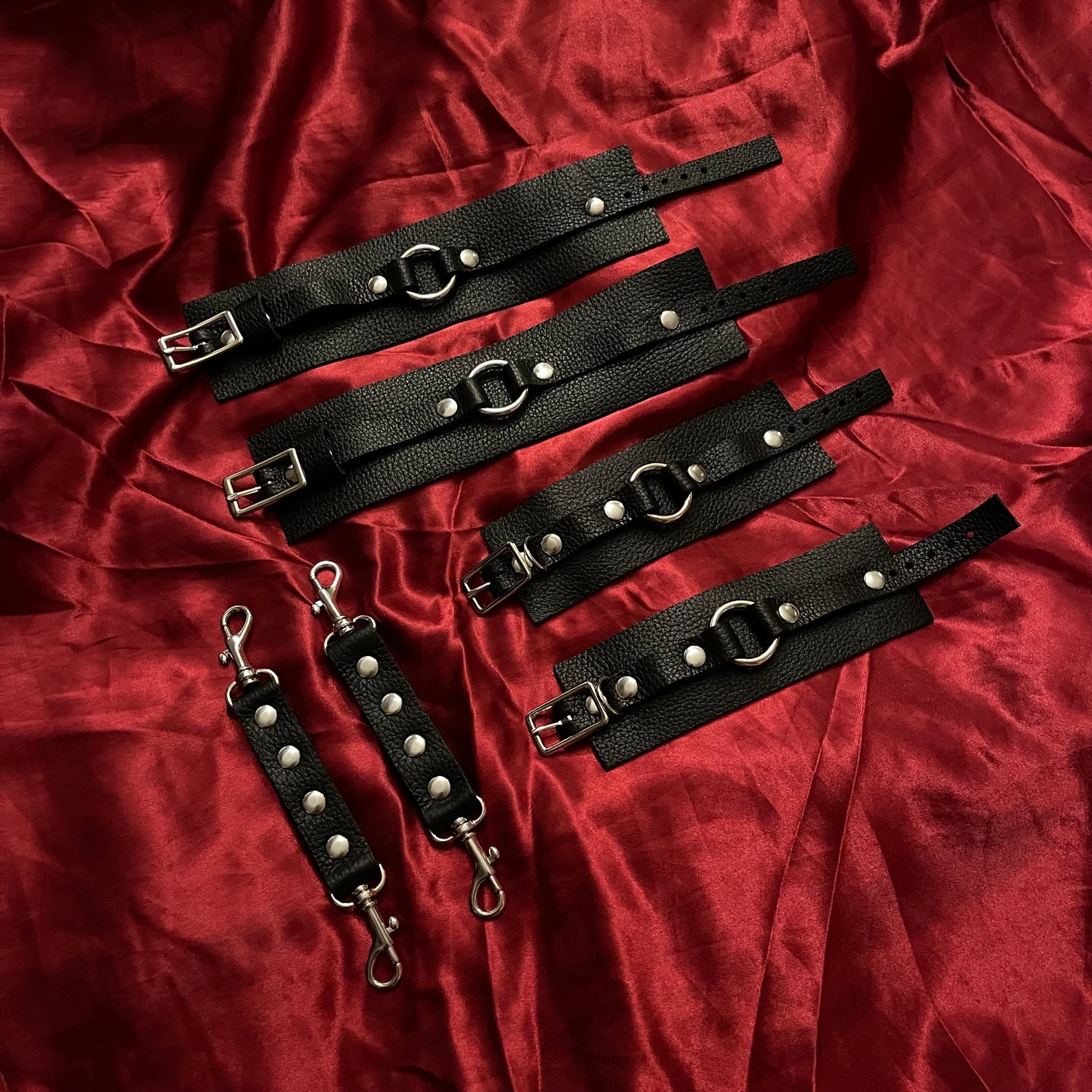 handmade to order genuine leather handcuff and ankle cuff set with two cuff connectors!