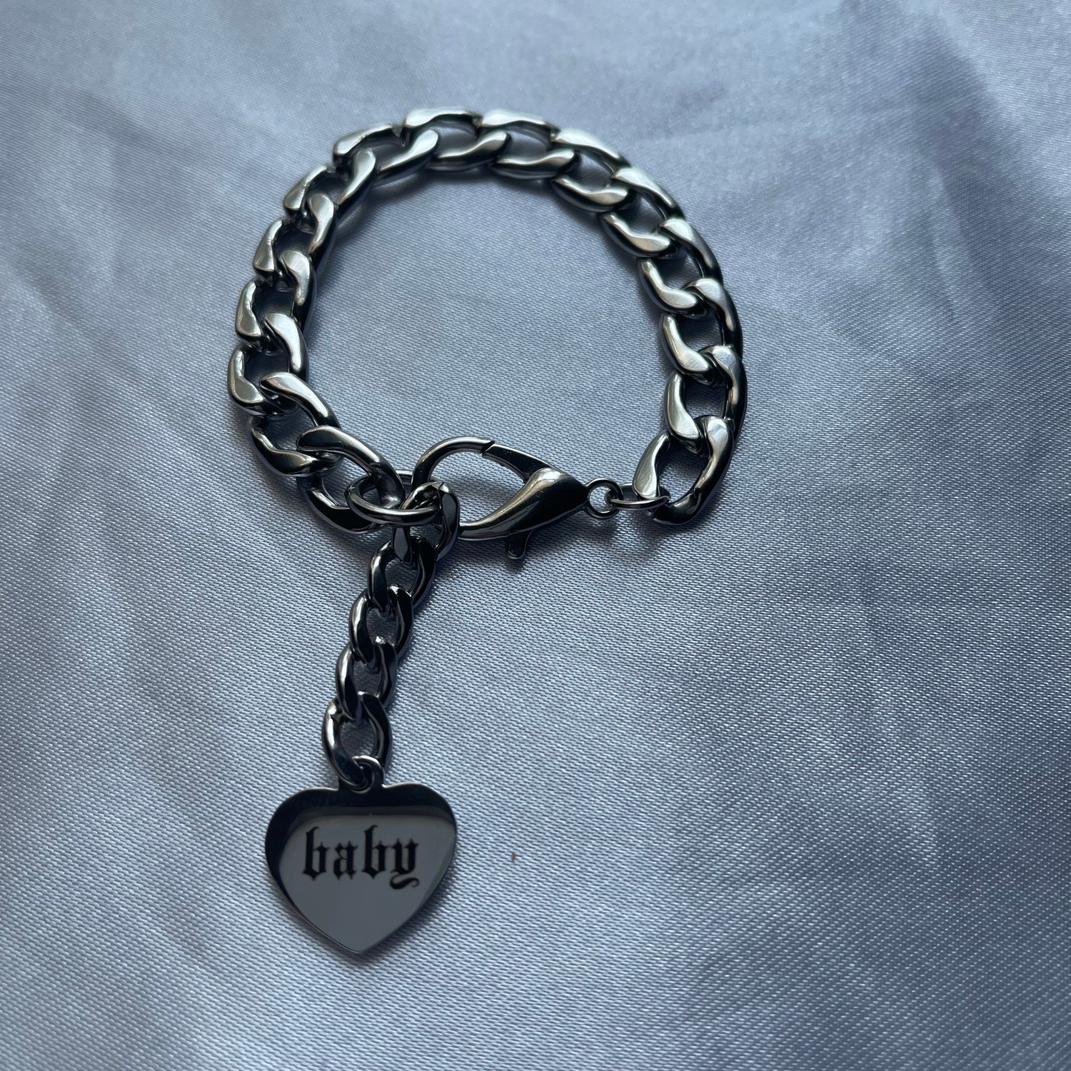 stainless steel chain and a stainless steel heart charm and closes with an oversized lobster clasp to make it a lil easier to put on :)