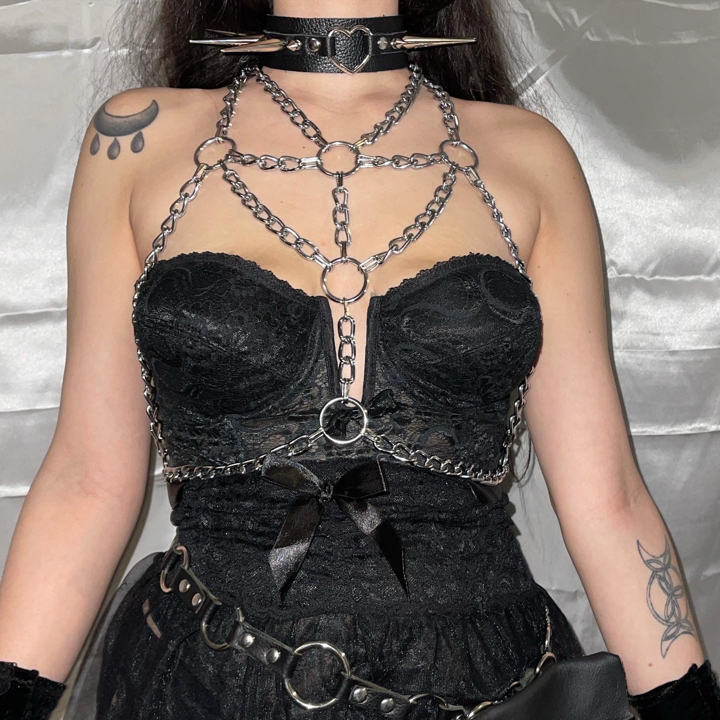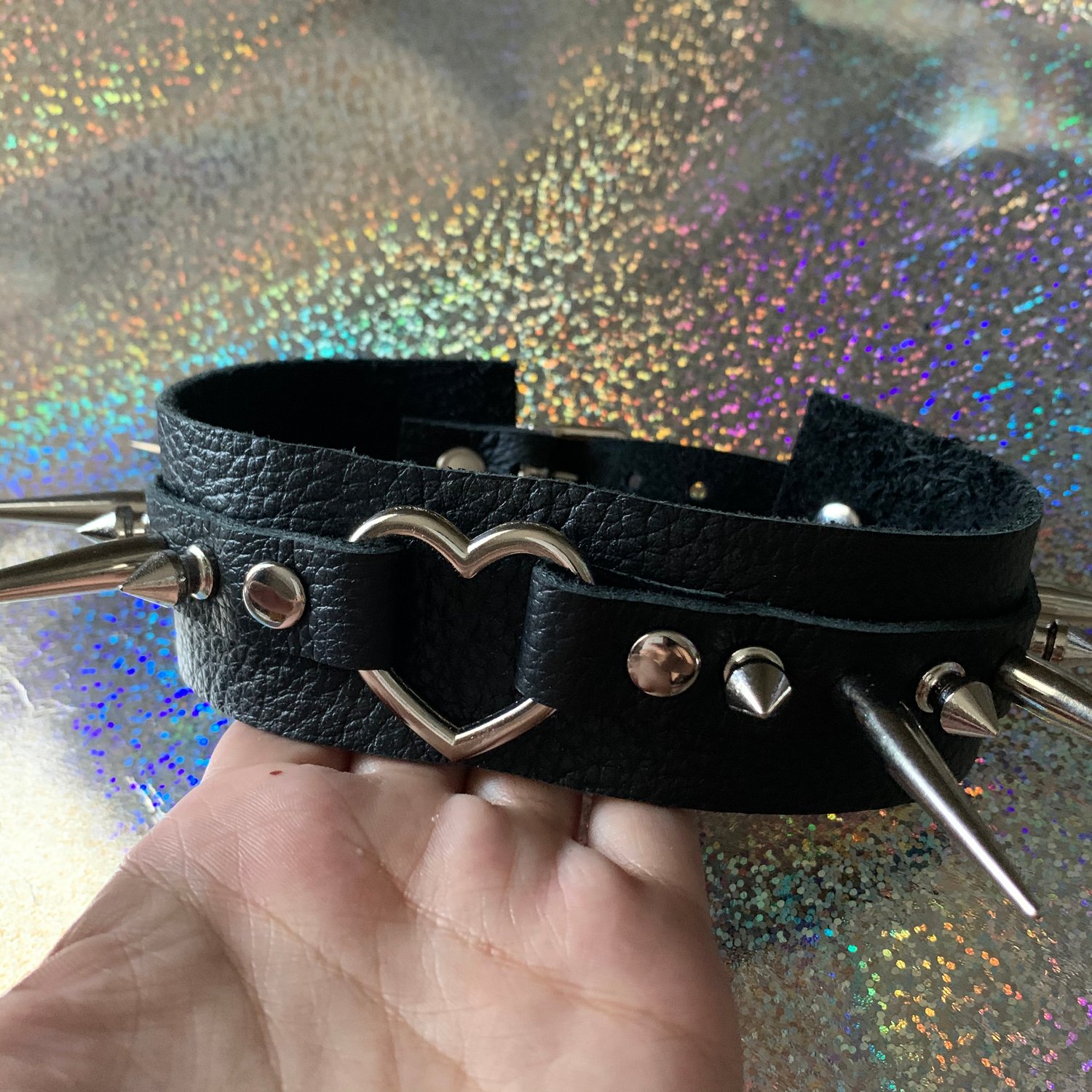 Genuine black leather with a heart centerpiece surrounded by a mix of smaller and x large spikes
