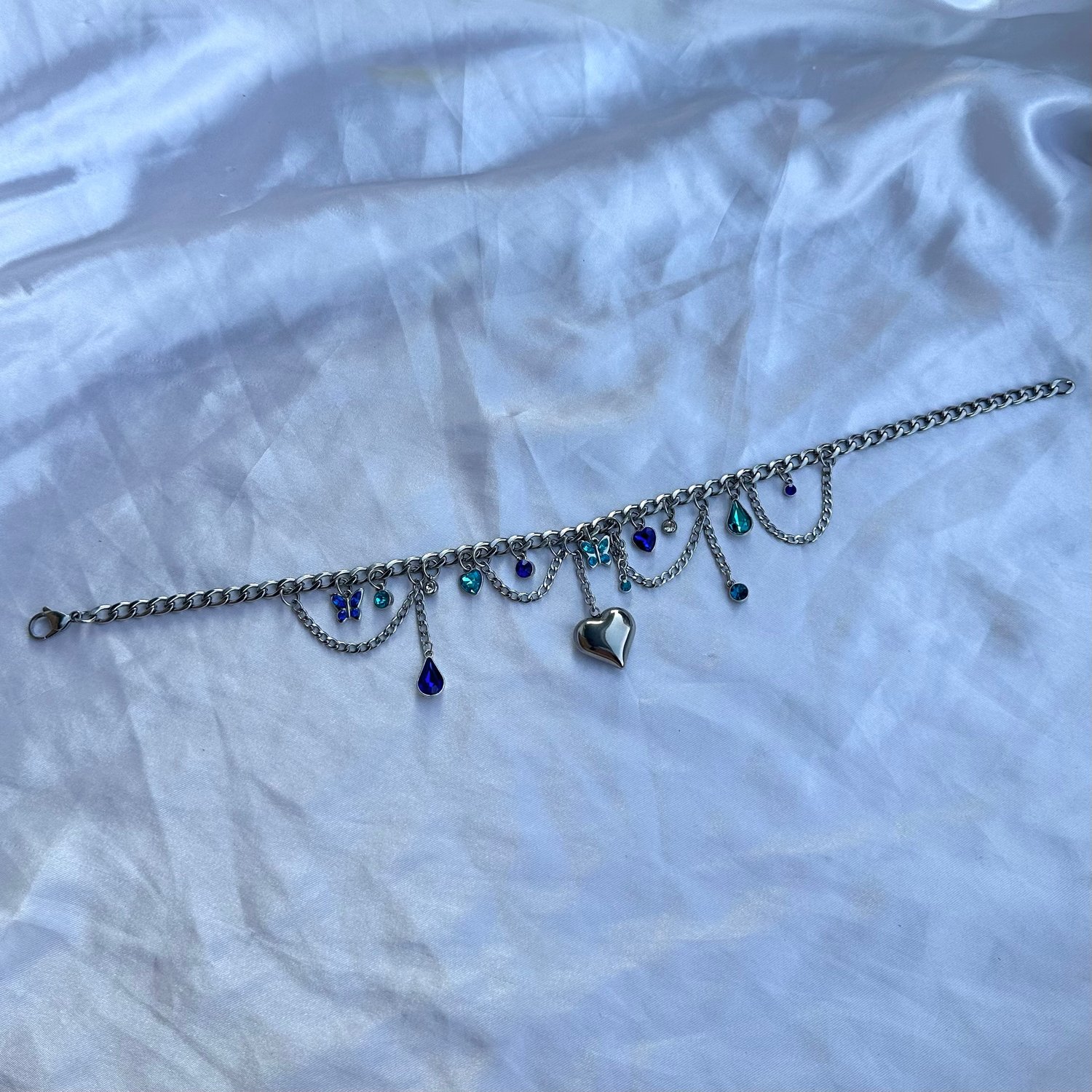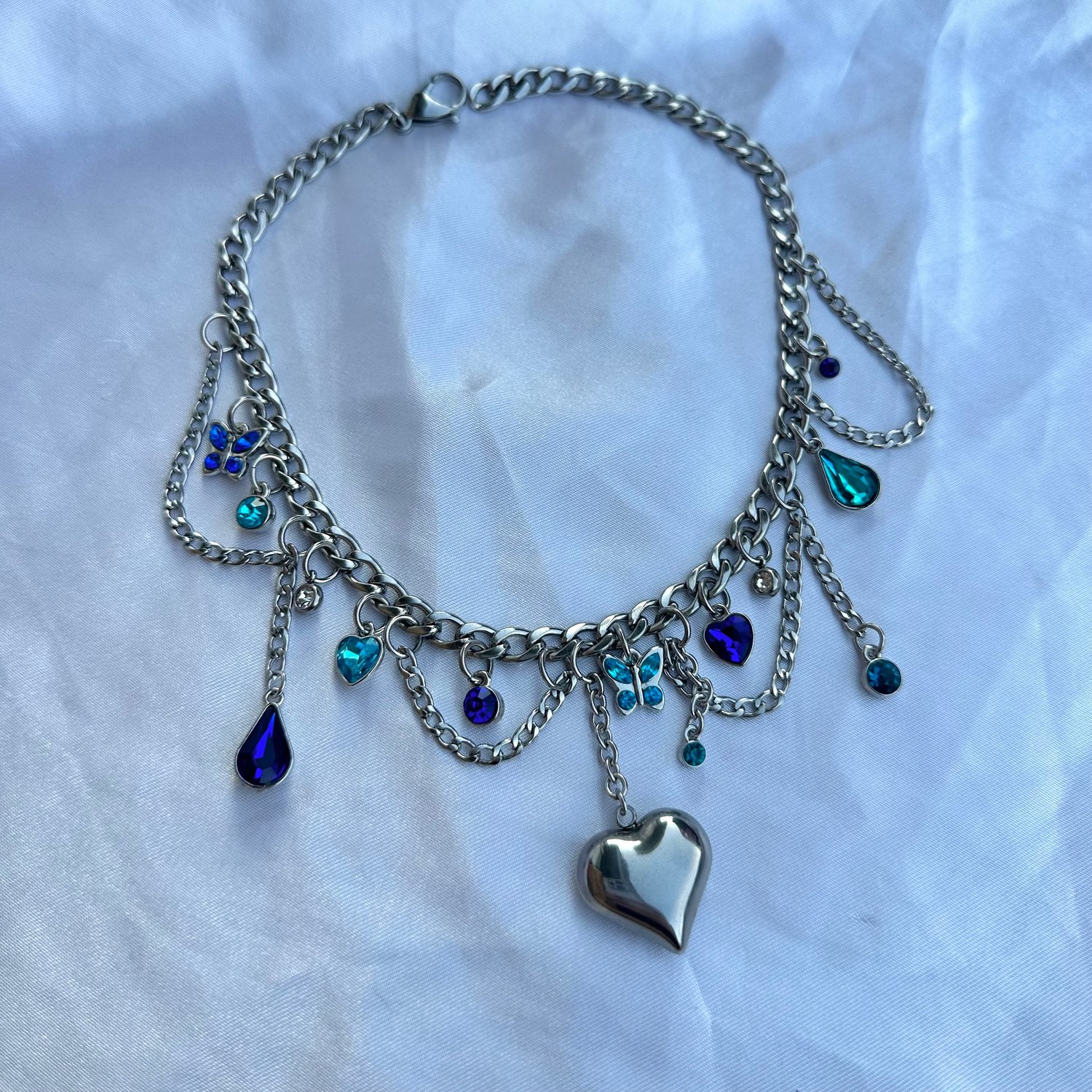 handmade steel chain necklace with rhinestone charms and a steel heart centerpiece