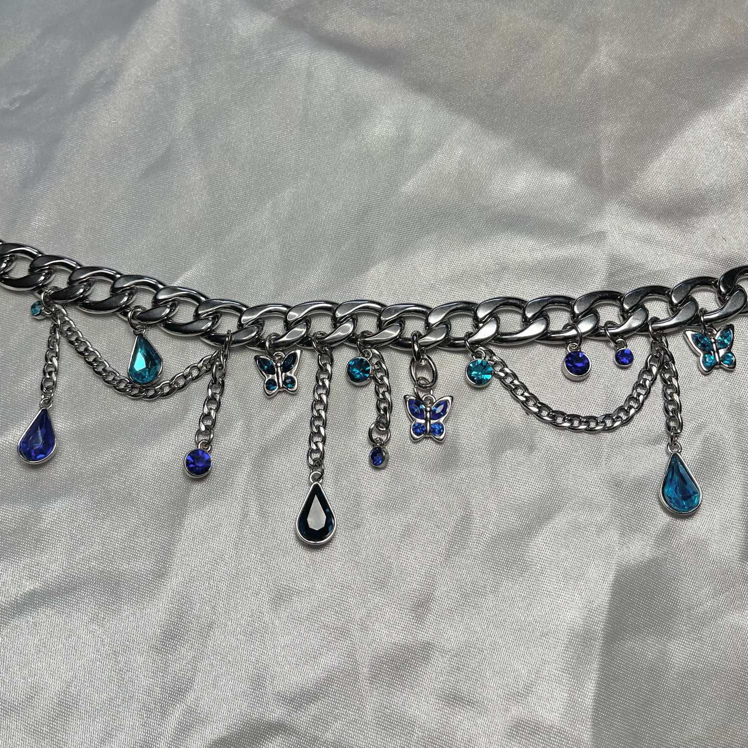 handmade to order stainless steel chain with a bunch of rhinestone charms. standard size adjustable between 13-15 inches but can be made in any size upon request! just attach a note with your order stating the desired fit