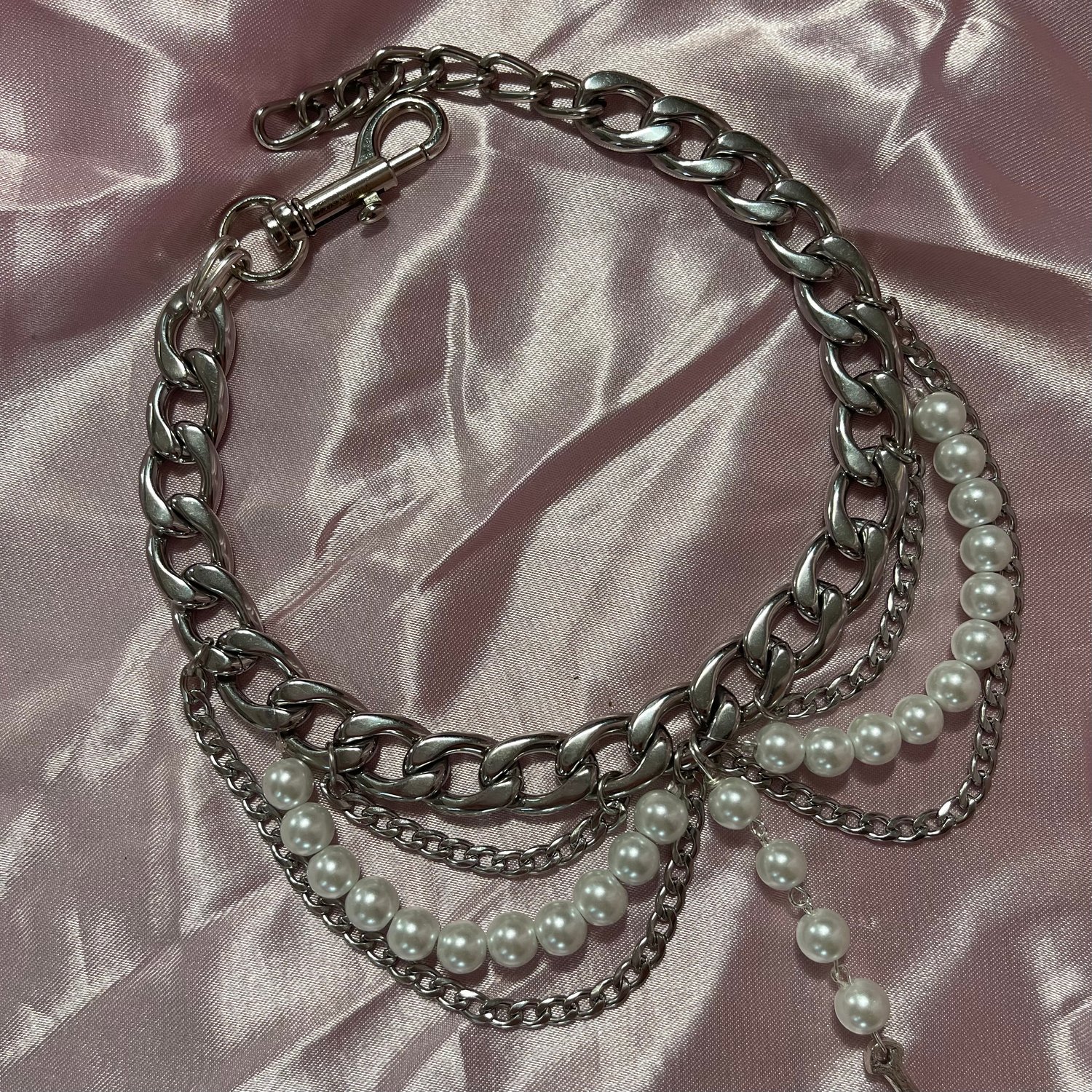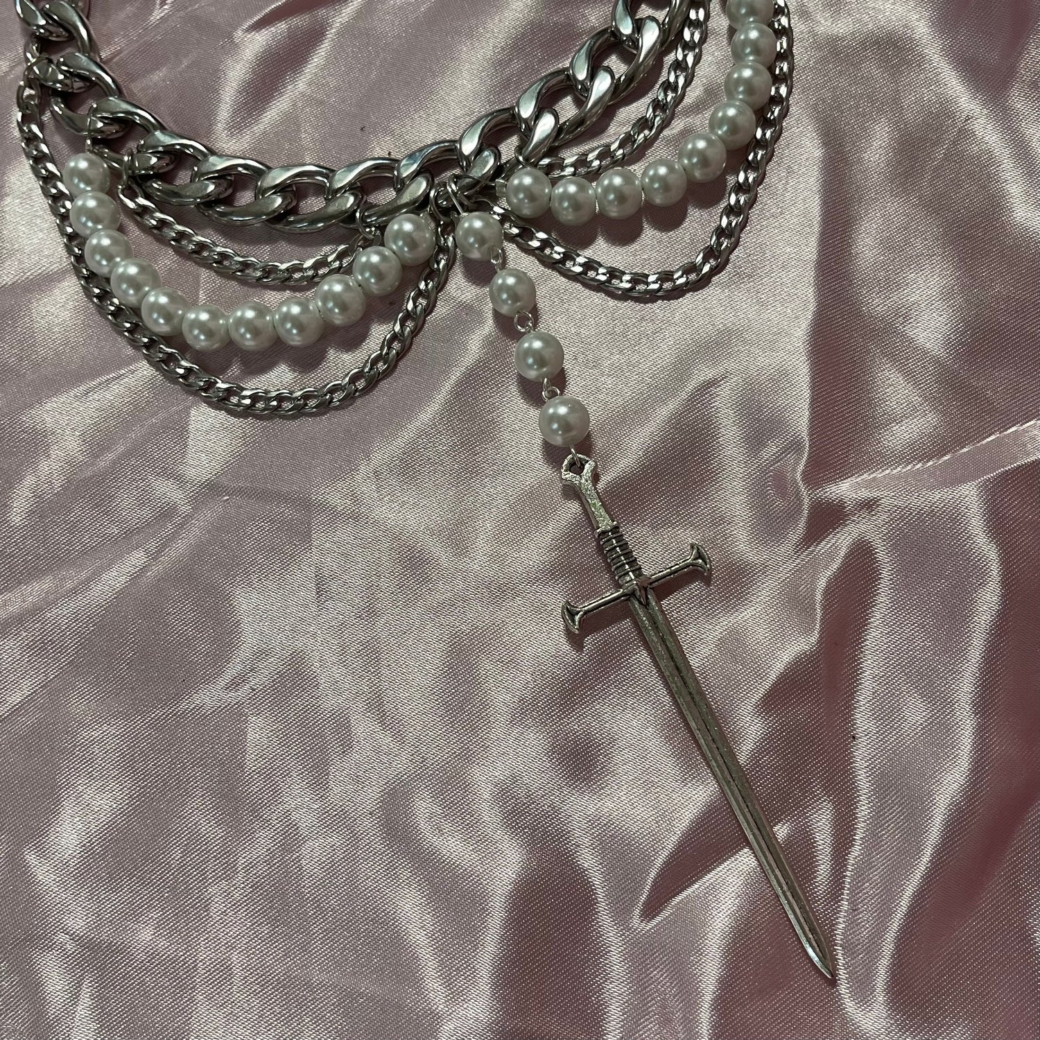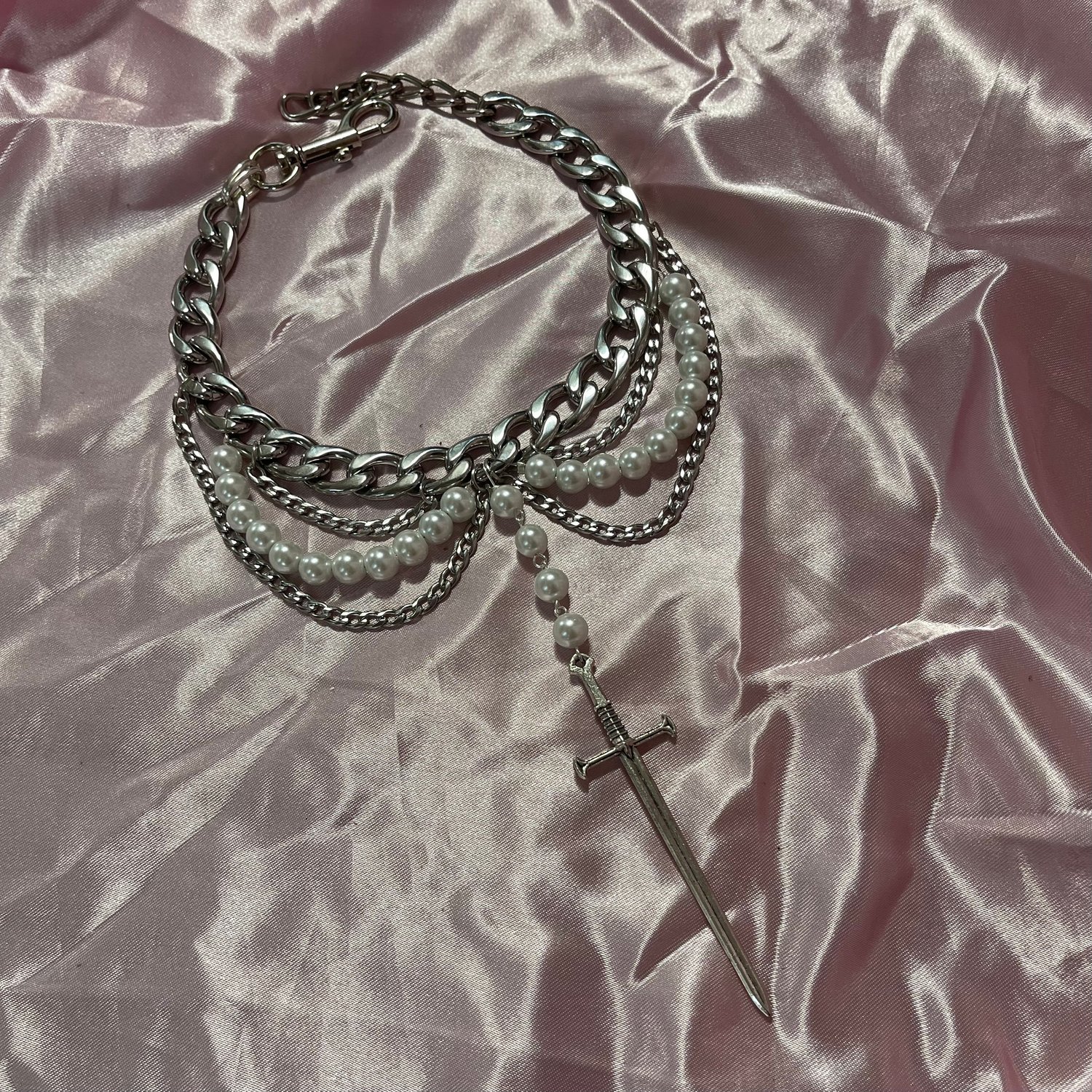 Handmade stainless steel chain with faux pearl accents and an oversized sword pendant.